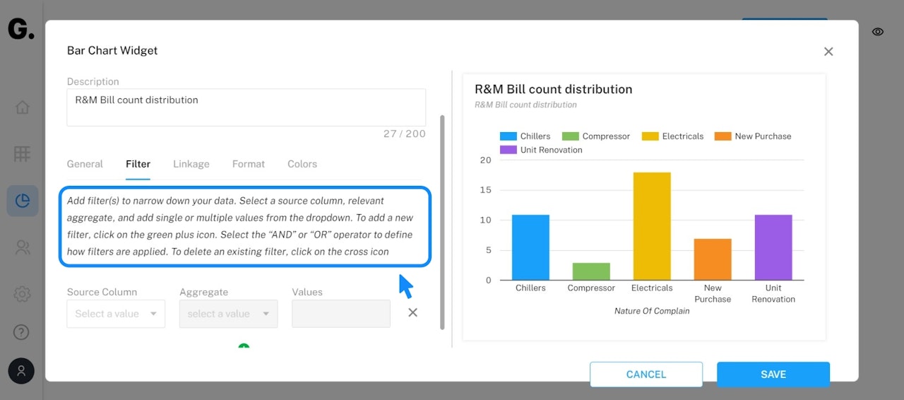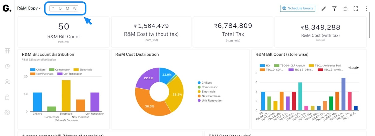 Easily conduct detailed analysis using the YQMW (Year Quarter Month Week) toggle and applying the period on all widgets of a dashboard!