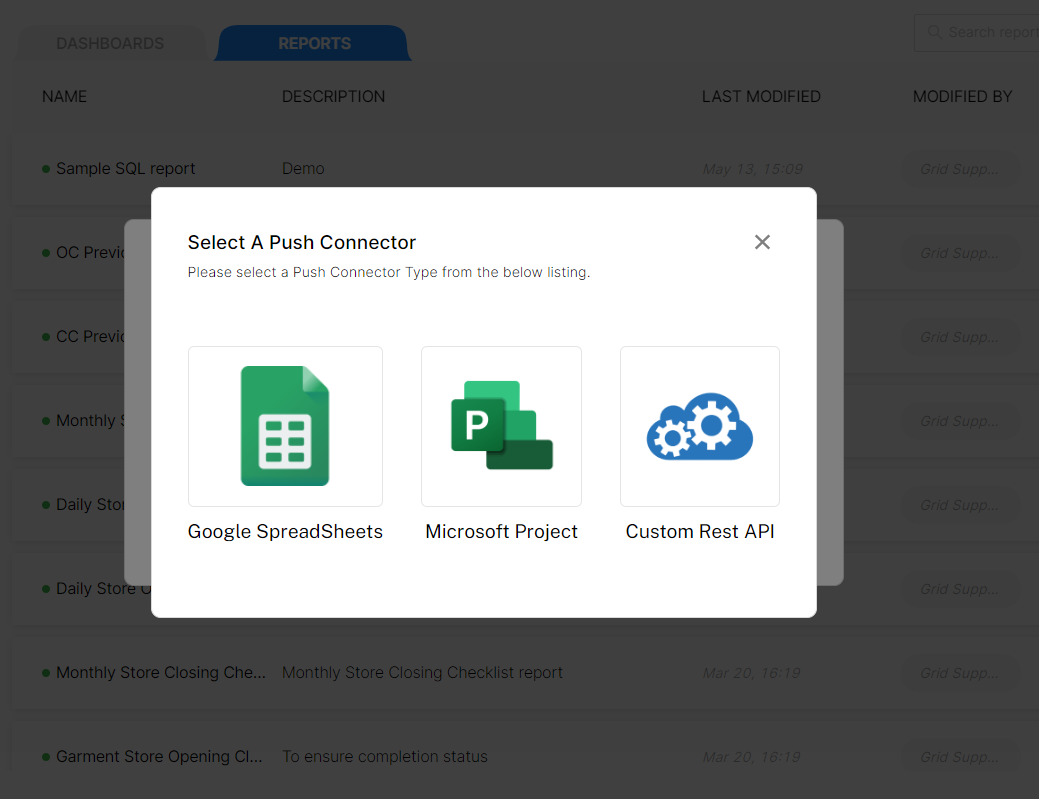 You can now configure API connectors (Push) for reports as well. For now, we have enabled Push Connectors for Google Sheets, MS Project and Custom REST API.