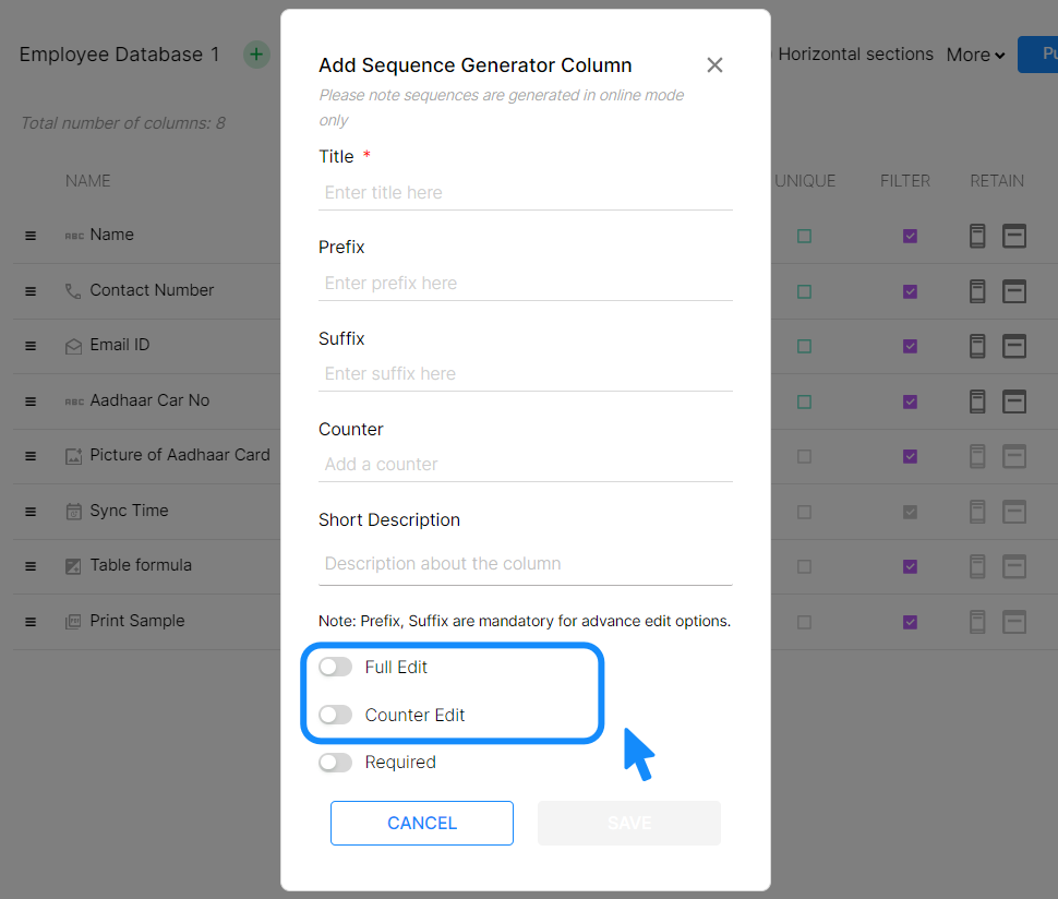 Sequence Generator column is now enhanced with 2 advanced toggles to edit, Full Edit and Counter Edit.