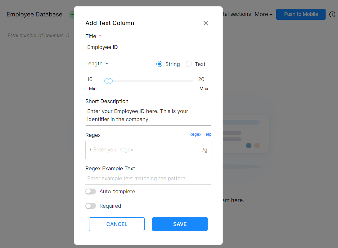 You can now setup Regular expression for the text column to validate the user input. You can also set custom length for the text field.